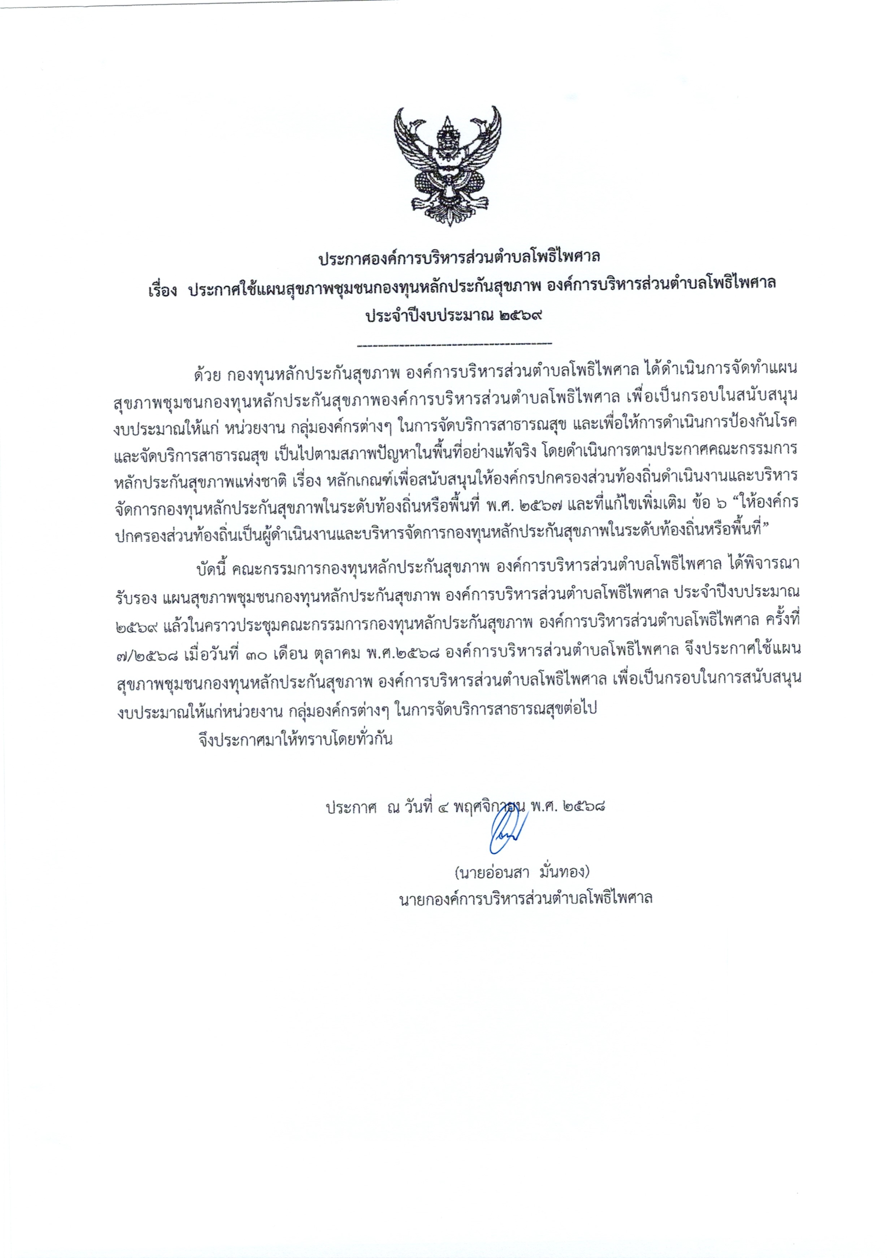 ประกาศใช้แผนสุขภาพชุมชนกองทุนหลักประกันสุขภาพ อบต.โพธิไพศาล ประจำปีงบประมาณ 2569