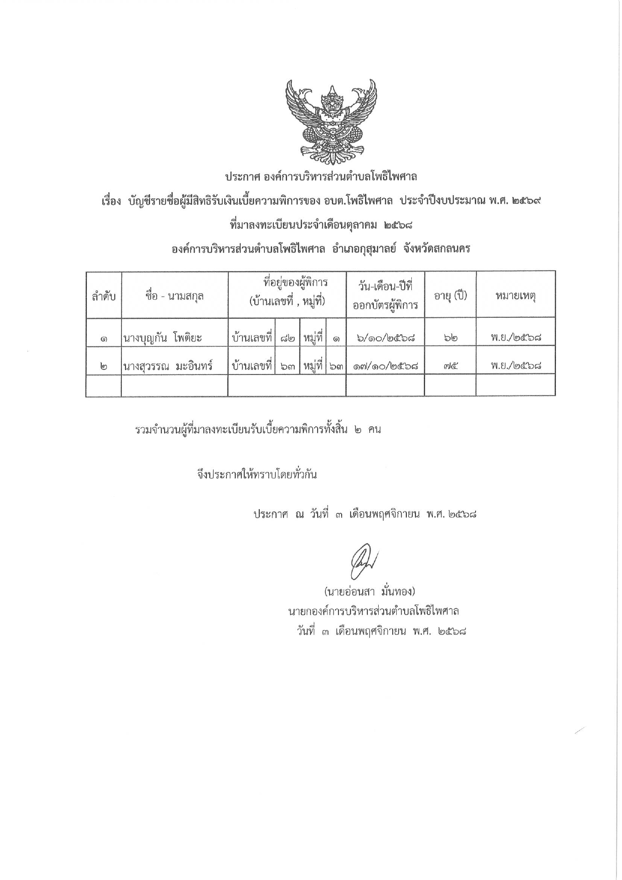 ประกาศรายชื่อผู้มีสิทธิรับเงินเบี้ยความพิการ ที่มาลงทะเบียนในเดือน ตุลาคม 2568
