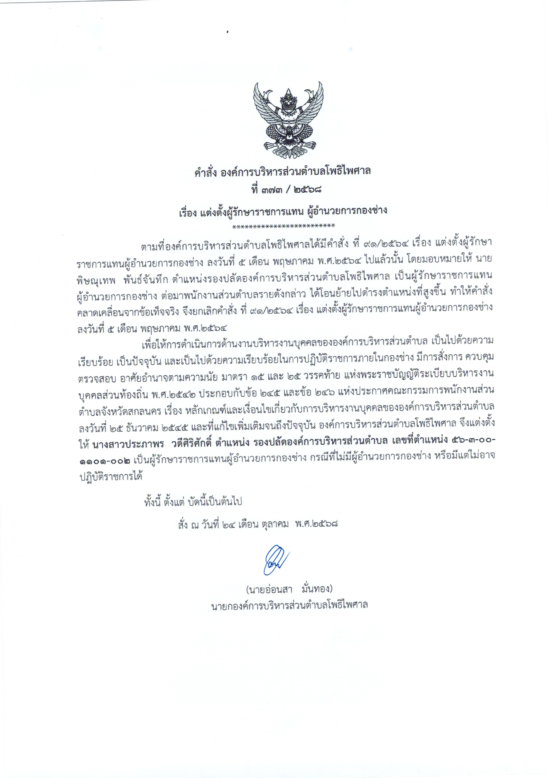 ← คำสั่ง แต่งตั้งผู้รักษาการแทน ปลัดองค์การบริหารส่วนตำบลโพธิไพศาล