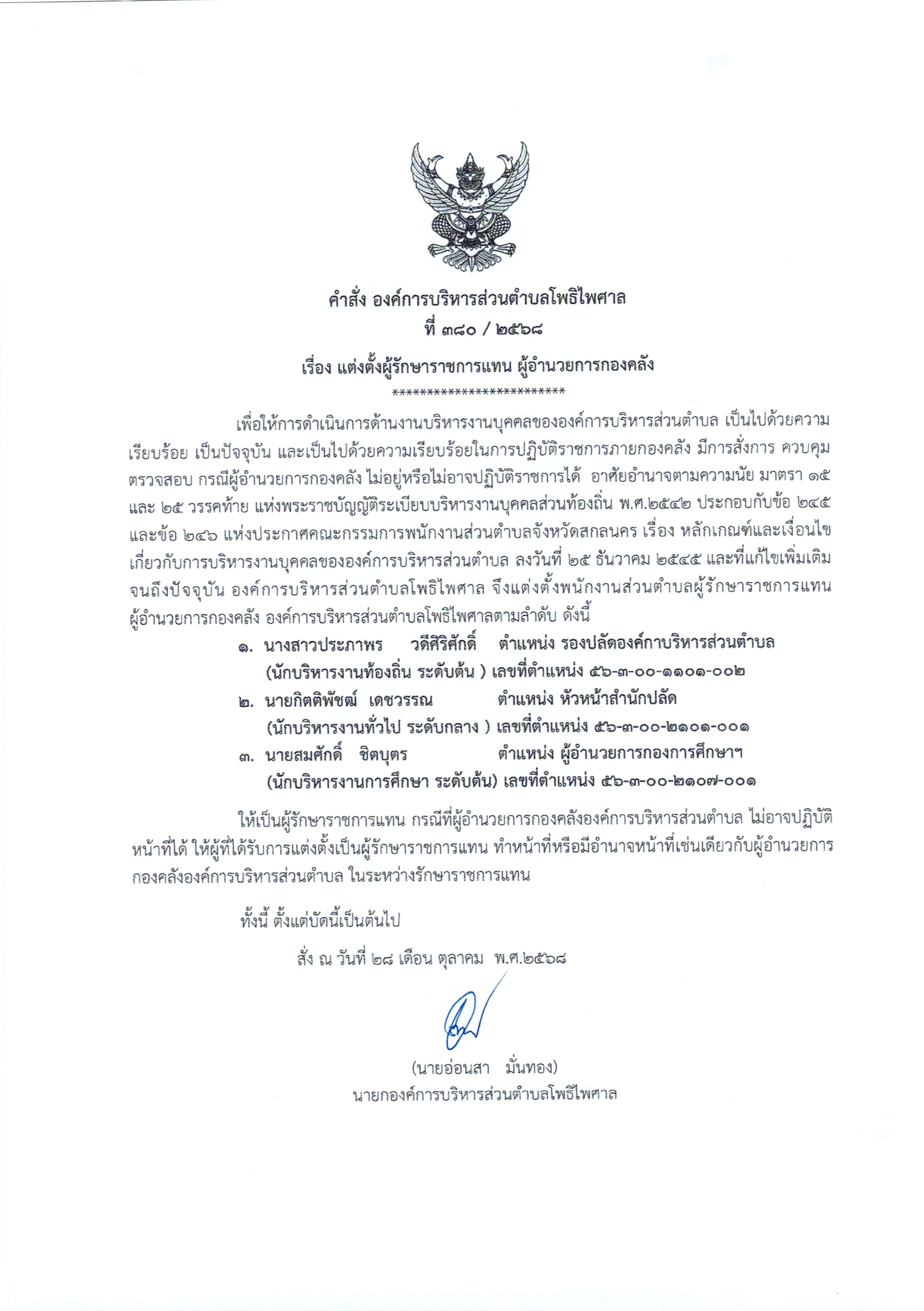 คำสั่ง แต่งตั้งผู้รักษาราชการแทน ผู้อำนวยการกองคลัง