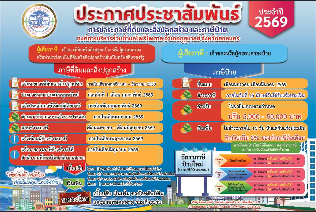 ประกาศประชาสัมพันธ์การชำระภาษีที่ดินและสิ่งปลูกสร้างและภาษีป้าย ประจำปี 2569