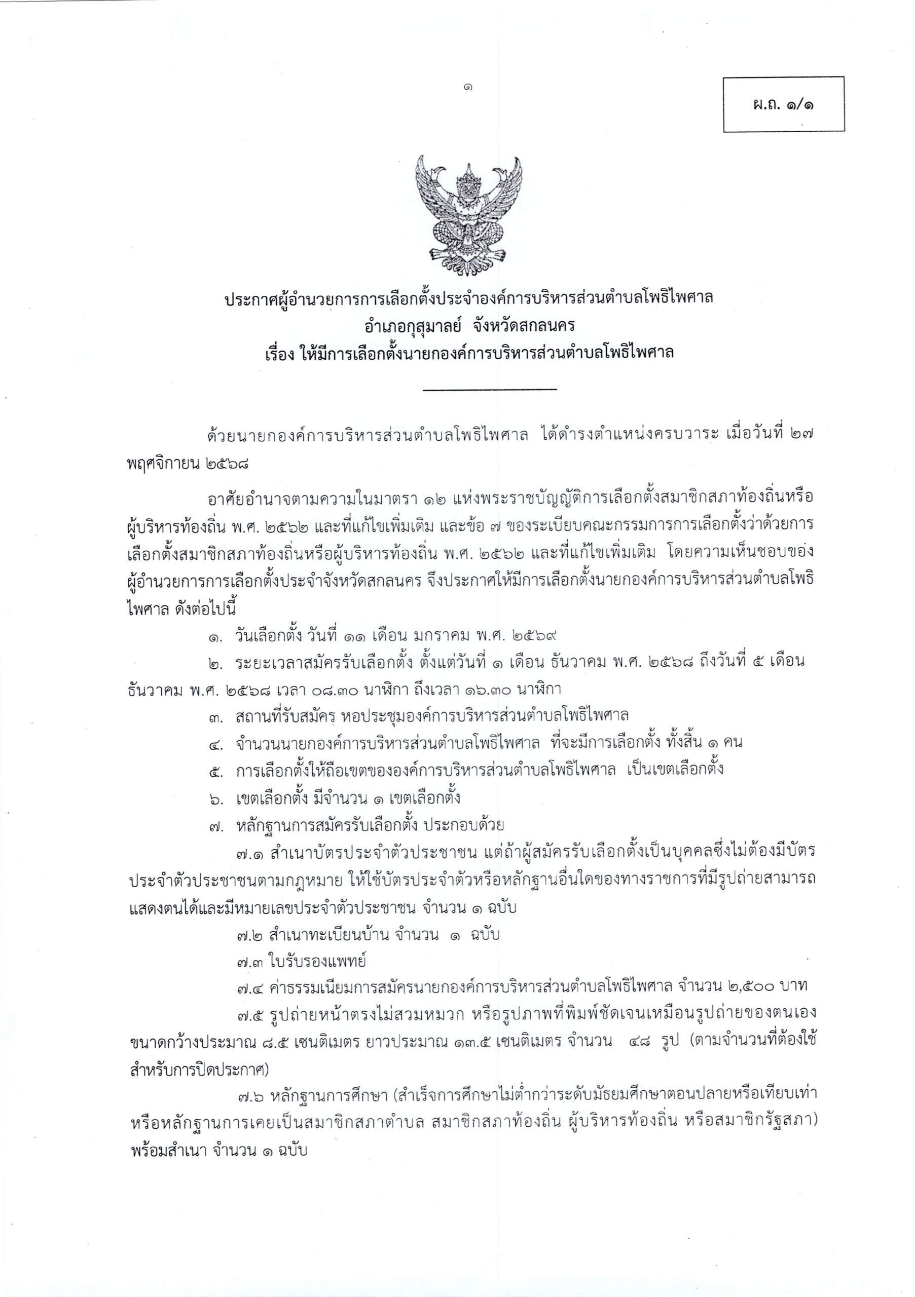 ประกาศผู้อำนวยการการเลือกตั้งประจำองค์การบริหารส่วนตำบลโพธิไพศาล เรื่องให้มีการเลือกตั้งนายกองค์การบริหารส่วนตำบลโพธิไพศาล