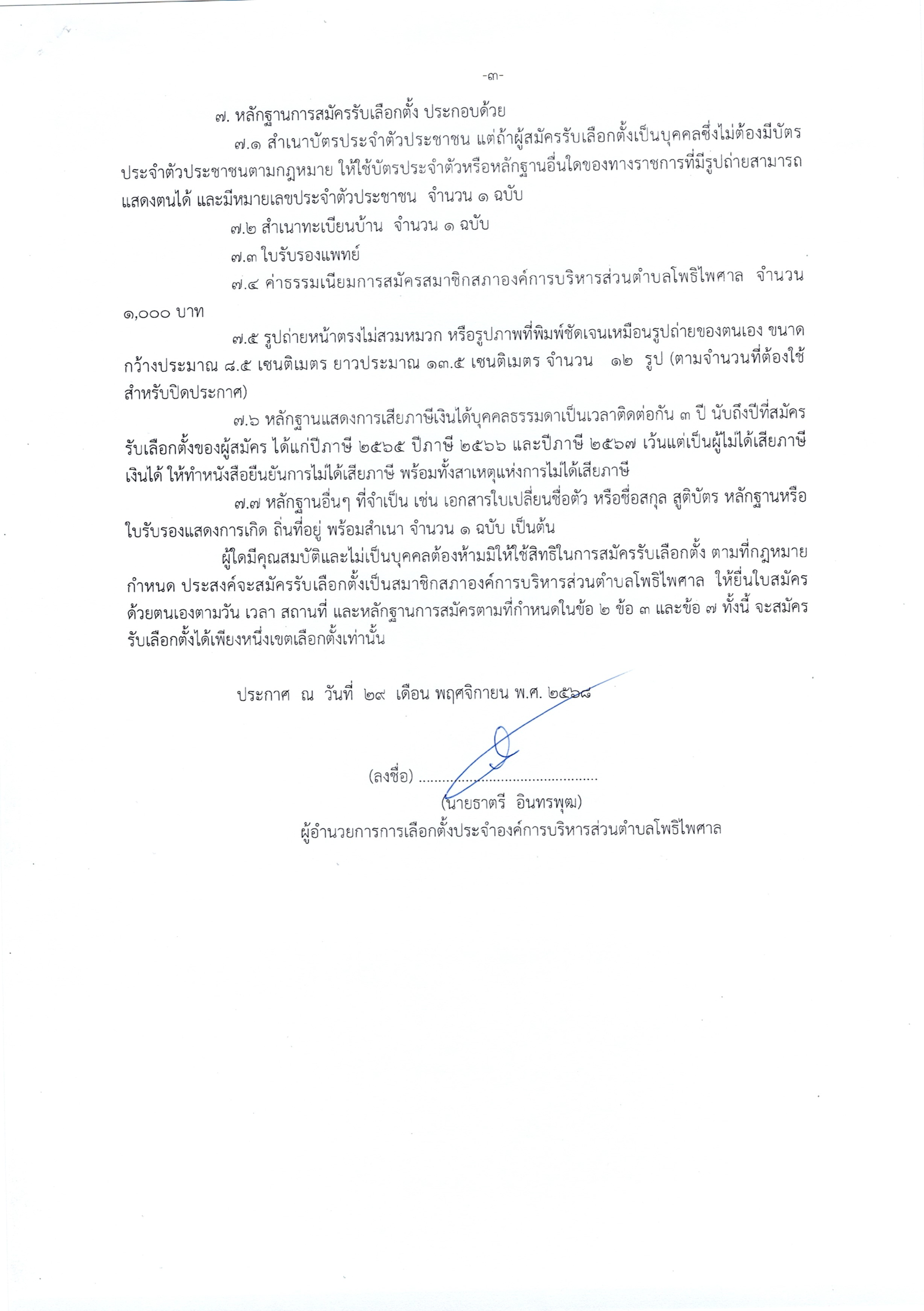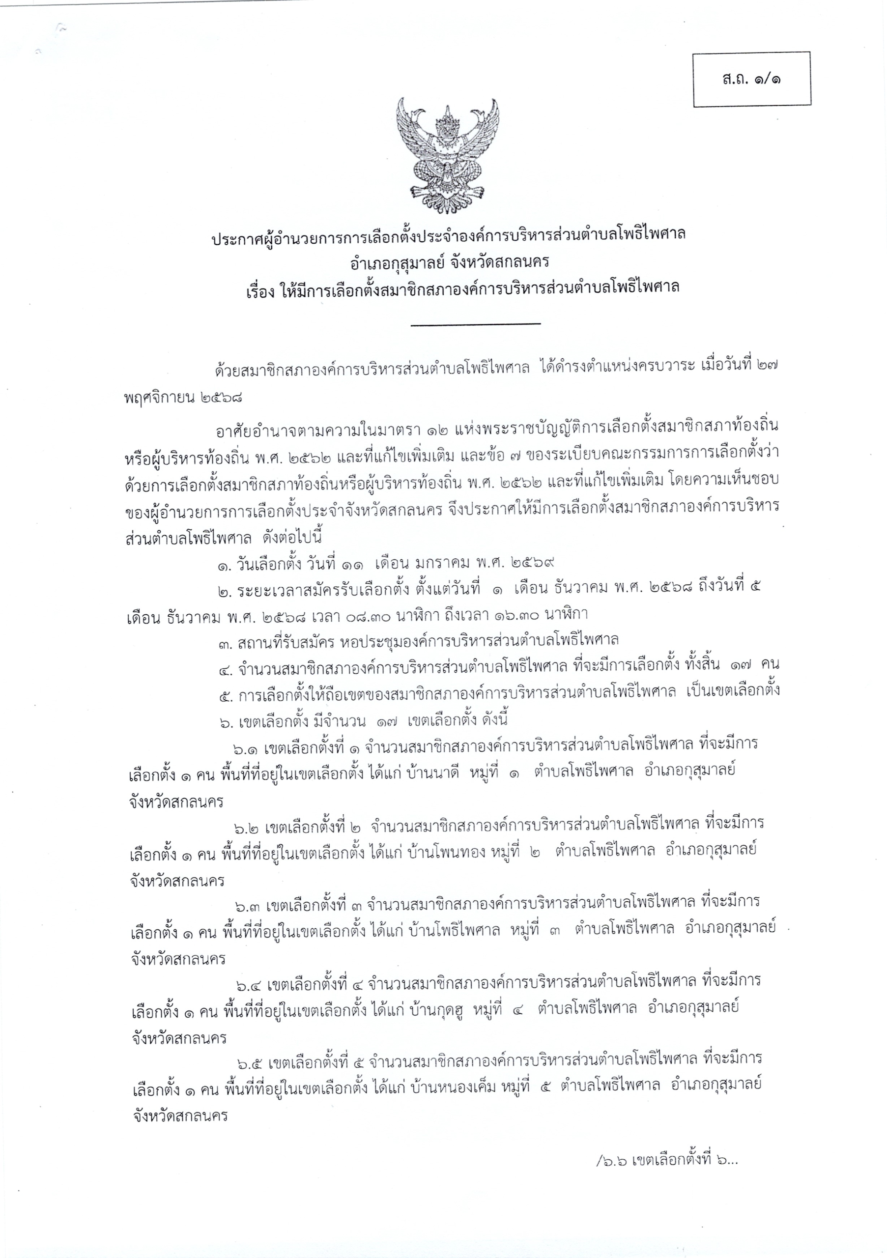 ประการผู้อำนวยการการเลือกตั้งประจำองค์การบริหารส่วนตำบลโพธิไพศาล เรื่องให้มีการเลือกตั้งสมาชิกสภาองค์การบริหารส่วนตำบลโพธิไพศาล