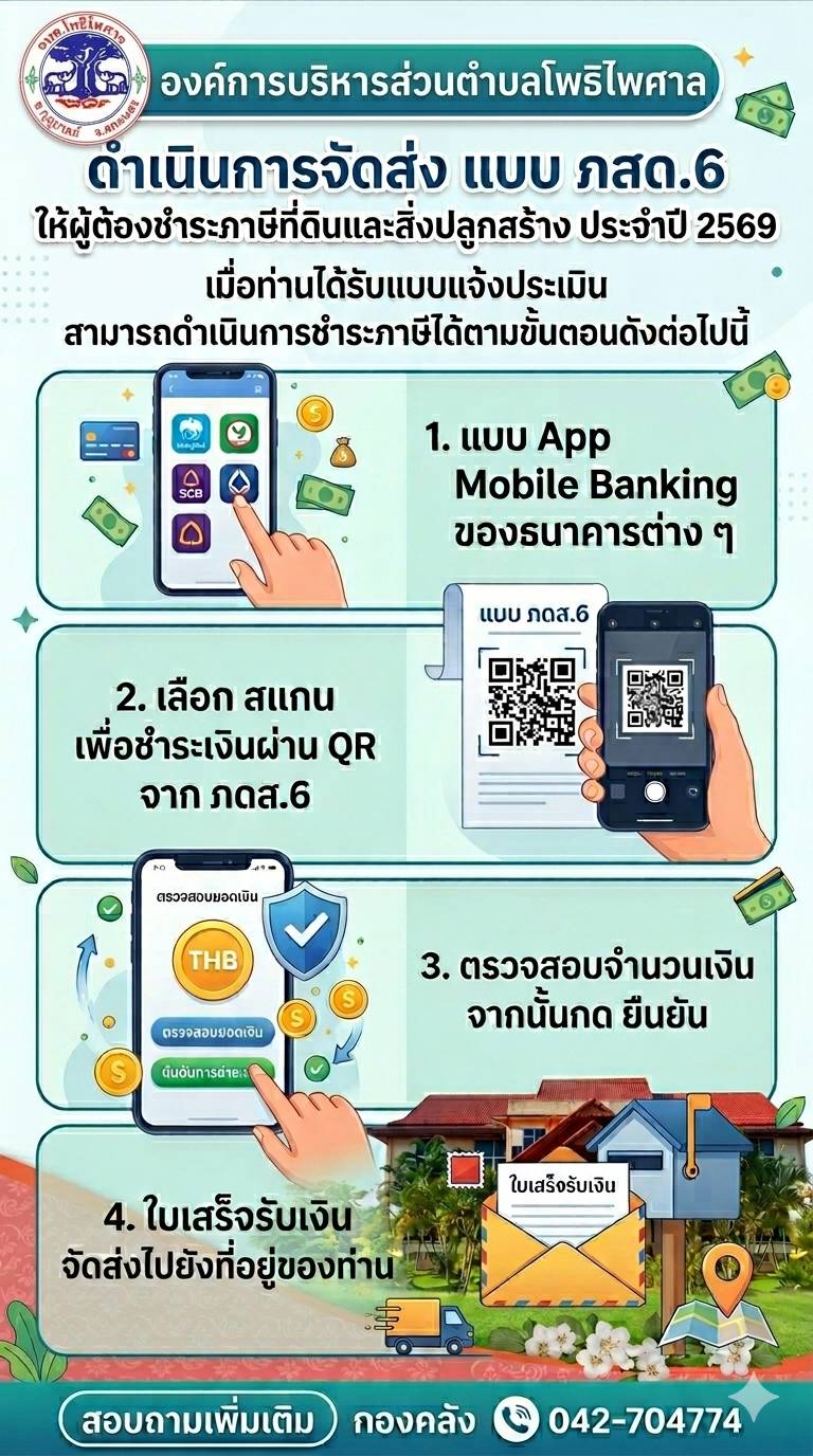 อบต.โพธิไพศาล ประชาสัมพันธ์ การดำเนินการจัดส่ง แบบ ภสด.6 ให้ผู้ต้องชำระภาษีที่ดินและสิ่งปลูกสร้าง ประจำปี 2569